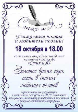 18 октября центральная городская библиотека им. Л.Н. Толстого приглашает любителей поэзии, молодых поэтов, мастеров поэтического слова на очередное заседание поэтического клуба «СтихиЯ».